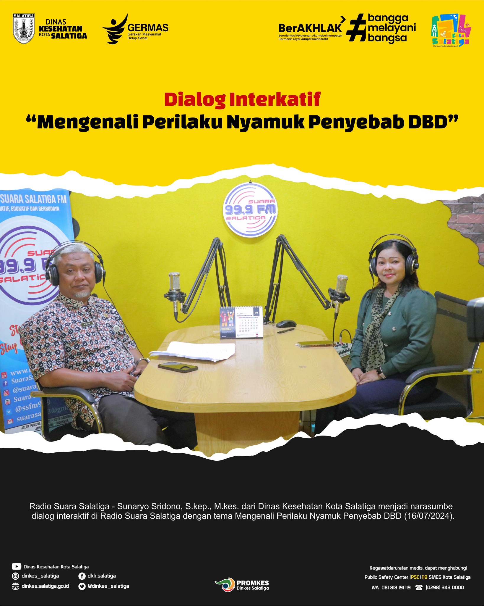 Radio Suara Salatiga – Sunaryo Sridono, S.kep., M.kes. dari Dinas Kesehatan Kota Salatiga menjadi narasumber dialog interaktif di Radio Suara Salatiga dengan tema Mengenali Perilaku Nyamuk Penyebab DBD (16/07/2024).